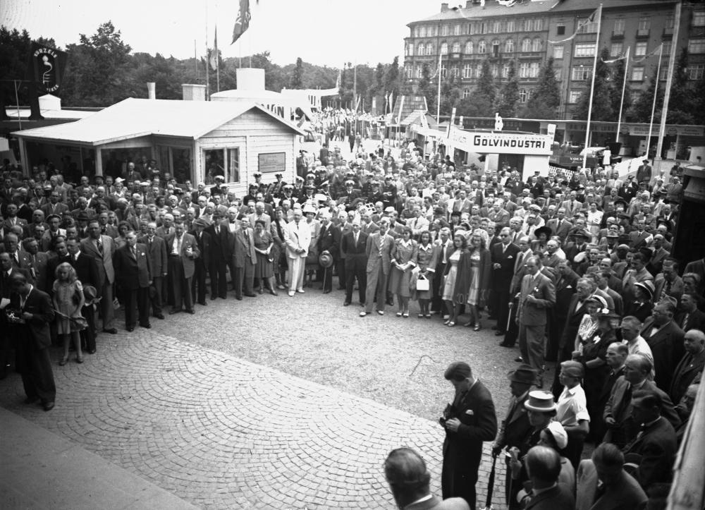 Utomhusbild tagen 1946 underSkånemässan. Folksamling som har samlats på ett torg. (Köpmannaförbundet?)