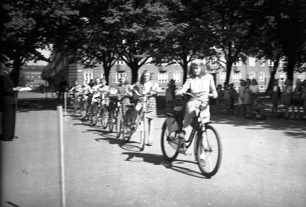 Utomhusbild tagen under "Trafikdagen" vid Rörsjöskolan i juni 1946. Bilden visar flickor som är ute och cyklar.