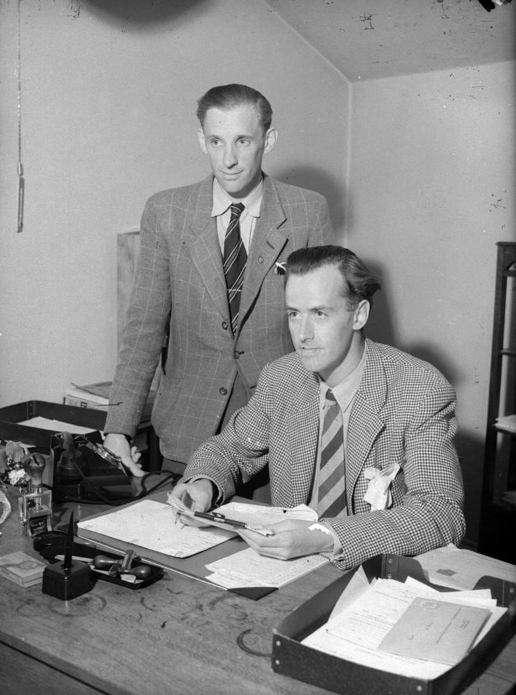 Inomhusbild från juni 1947 som visar 2 män på ett kontor.