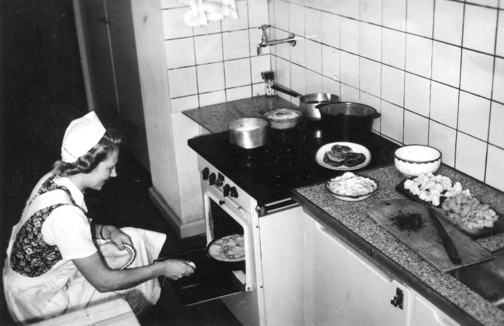 Inomhusbild som visar en kvinnlig elev som tar ut något ur en ugn. Bilden är tagen på Östra Grevie Folkhögskola i november 1942.