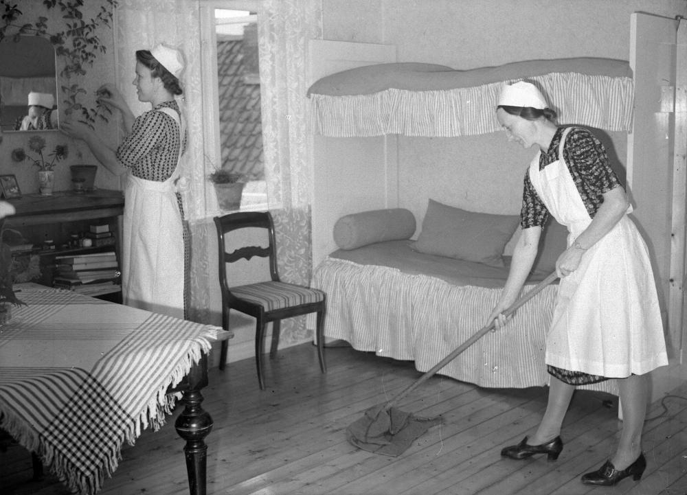 - Inomhusbild som visar två kvinnliga elever som städar och torkar golv. Bilden är tagen på Östra Grevie Folkhögskola i november 1942.