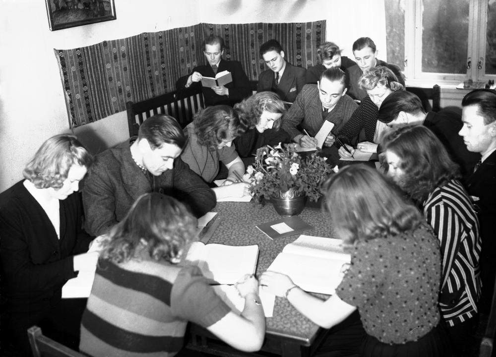 - Inomhusbild som visar både manliga och kvinnliga elever som studerar. Bilden är tagen på Östra Grevie Folkhögskola i november 1942.