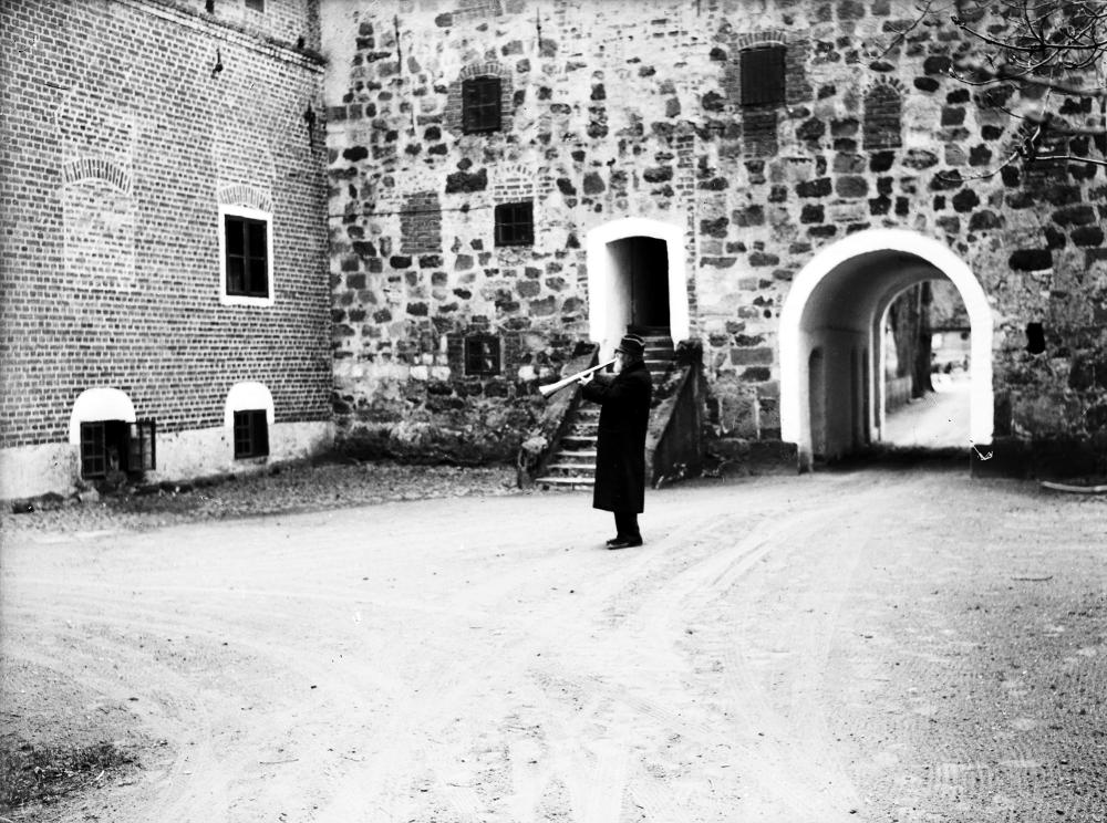 BOL 001312 :: trumpeter, borgeby slott, borggårdar, man, borggård, trumpet, män