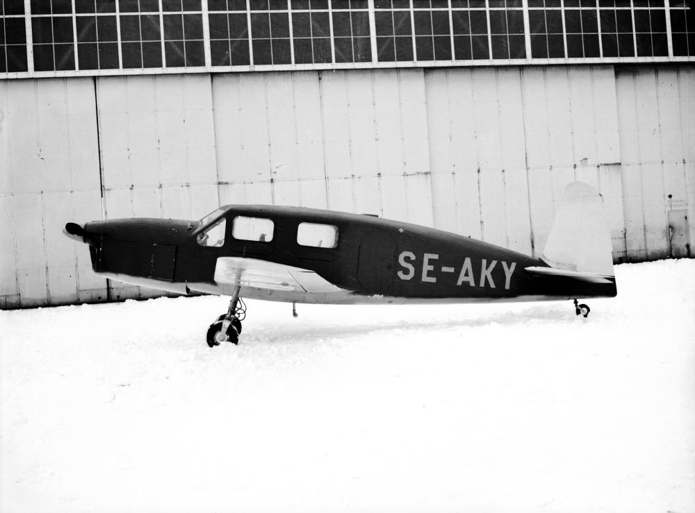 Utomhusbild som visar ett uppställt propellerflygplan med beteckning SE-AKY, utanför en hangar.