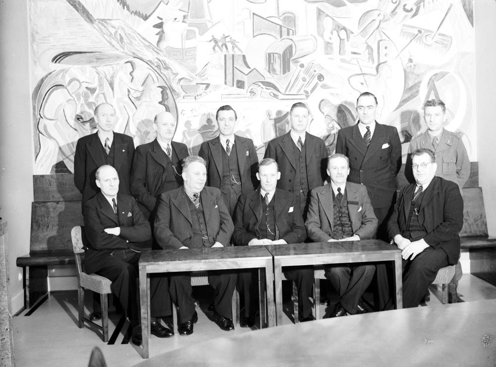 Inomhusbild som visar 11 kostymklädda män som samlats för ett gruppfoto.