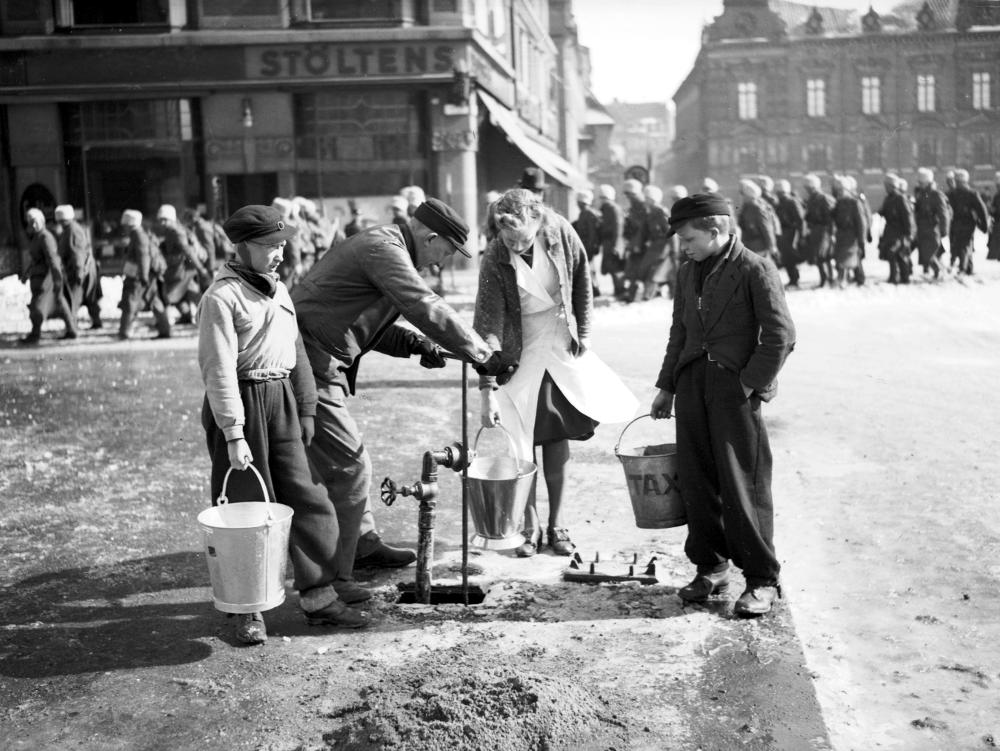 - Utomhusbild tagen vid Rådhuset som visar en man som tappar upp vatten ur en vattenledning, till en kvinna. Två pojkar väntar på sin tur med spannar.