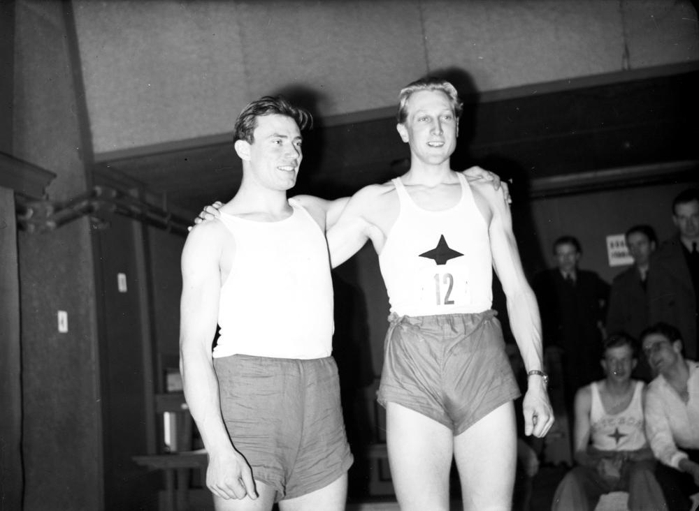Inomhusbild som visar två brottare i träningskläder som kramar om varandra före eller efter en match. Publik tittar på i bakgrunden.