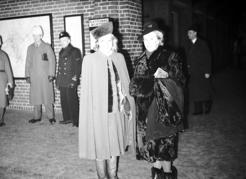 Utomhusbild tagen 1942 som visar Alice Babs tillsammans med en okänd kvinna. I bakgrunden står några män och tittar på.