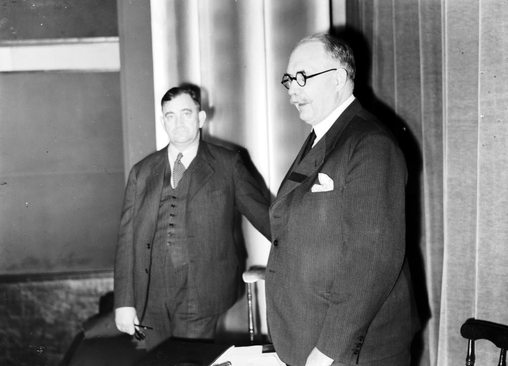 Inomhusbild som visar två kostymklädda män i Brunnstorp.