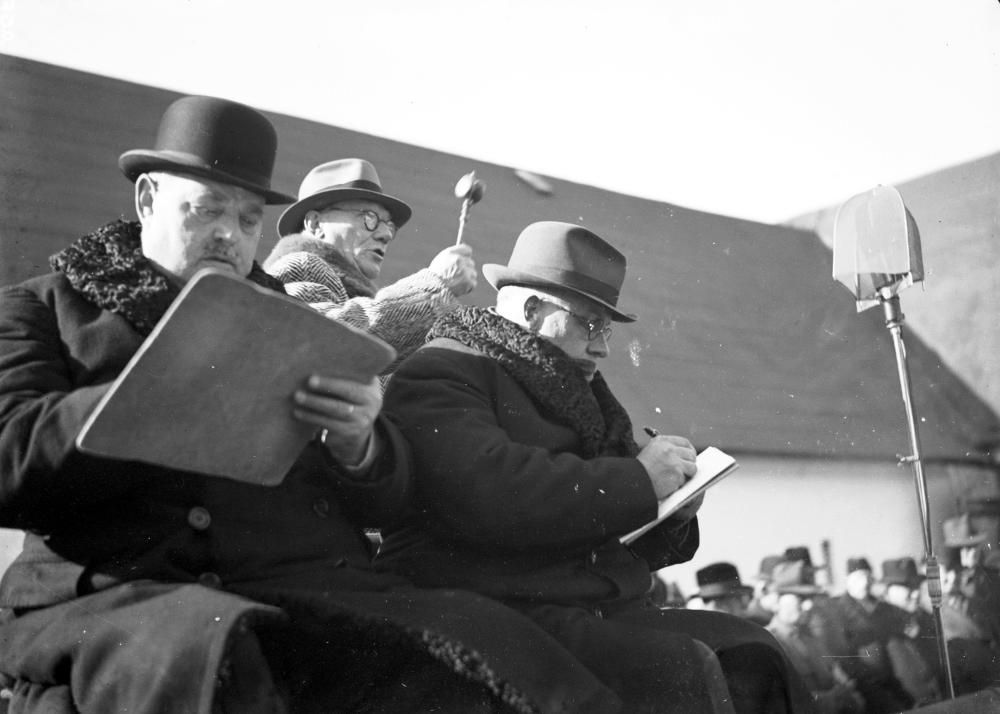 Utomhusbild som visar några män på en djurauktion. I förgrunden står en mikrofon.