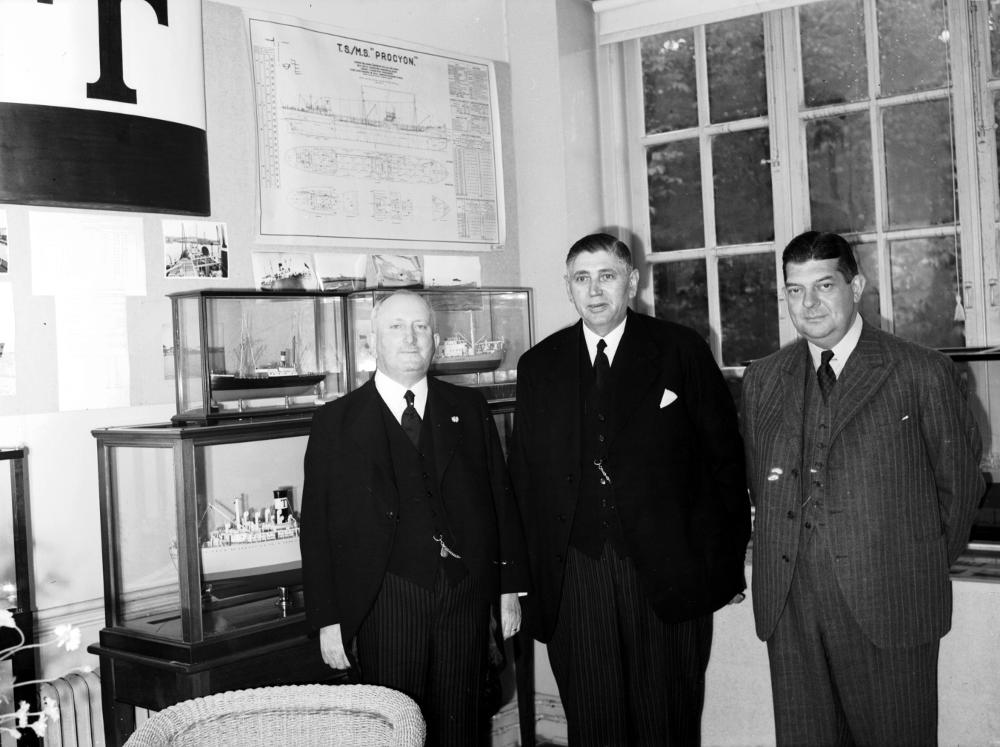 Inomhusbild som visar en marinutställning. 3 män tittar på miniatyrfartyg.