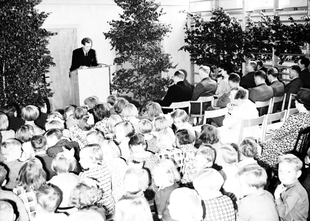 Inomhusbild som visar en präst som håller en predikan inför en församling.