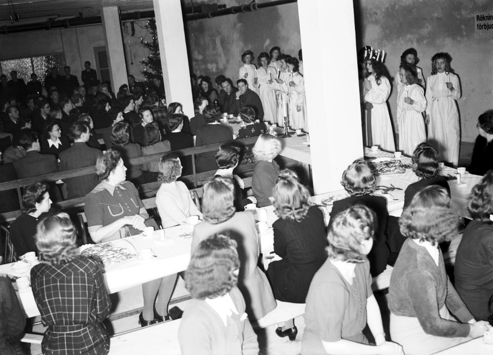 Inomhusbild som visar ett luciatåg inför en samling åskådare.