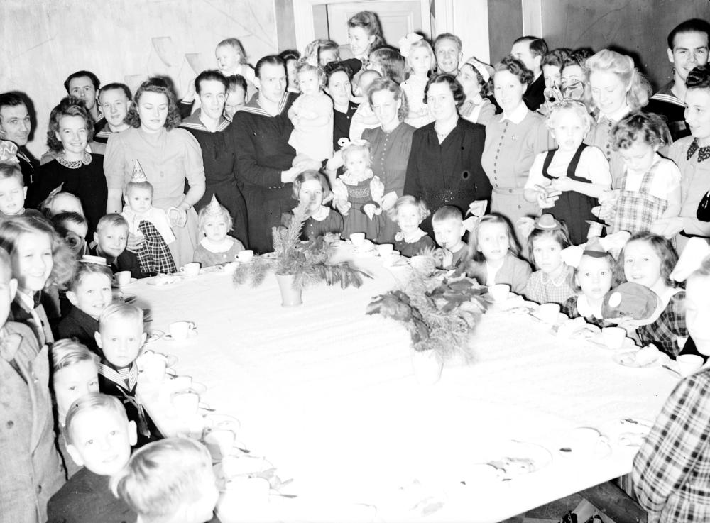 Inomhusbild som visar en mängd barn och vuxna på ett barnkalas. Barnen sitter till bords.