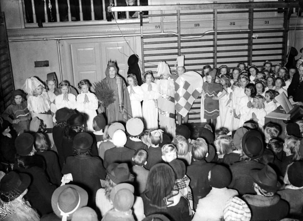 - Inomhusbild som visar ett luciatåg med tärnor och tomtenissar inför en samling åskådare.