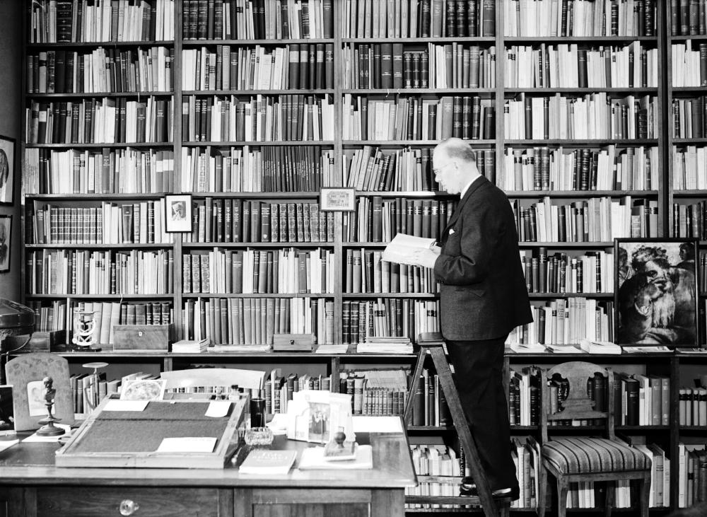 Inomhusbild som visar en läsande man som står framför bokhyllor i ett bibliotek.