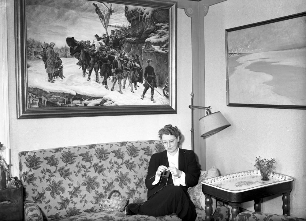 Inomhusbild som visar en kvinna som sitter och stickar i en soffa under en tavla föreställande Karl XII's likfärd.