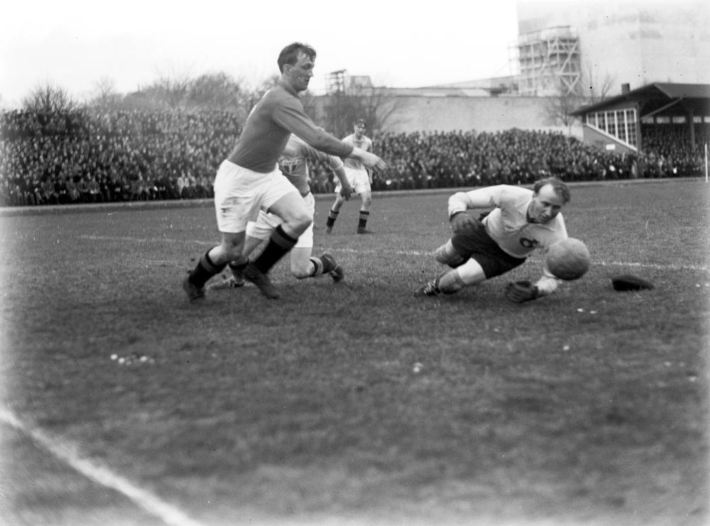 Utomhusbild som är tagen under en fotbollsmatch. Bilden visar några spelare och en målvakt i kamp om bollen.