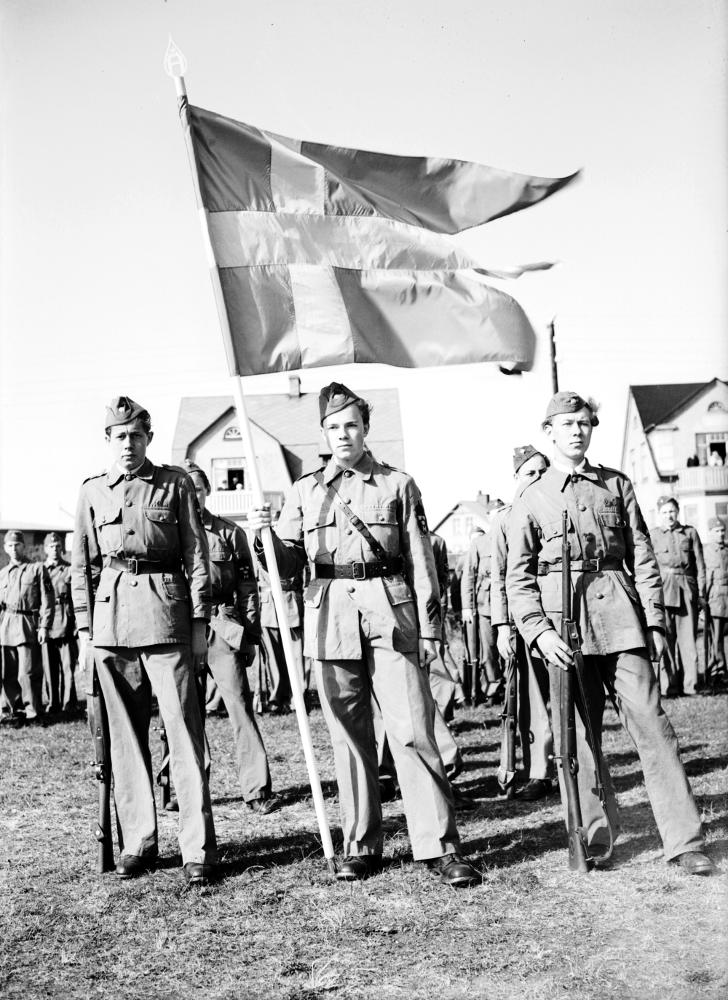 Utomhusbild som visar några soldater iklädda uniform uppställda på led. En av dem håller en flagga och de andra gevär.