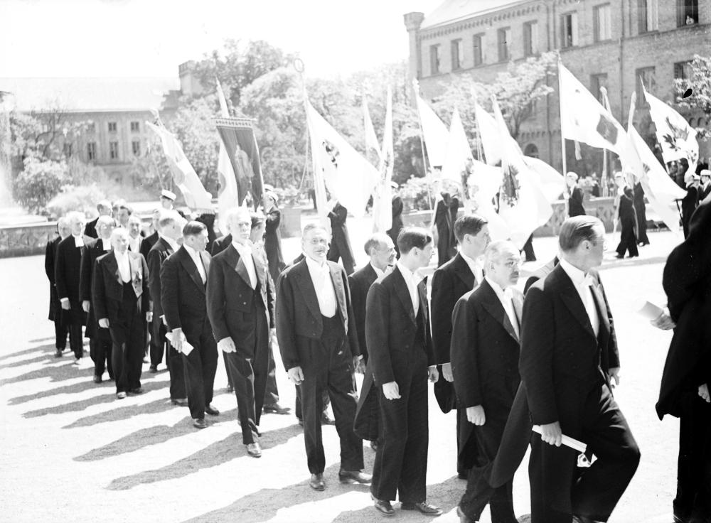 Utomhusbild som visar frackklädda män som går i en procession med flanor.