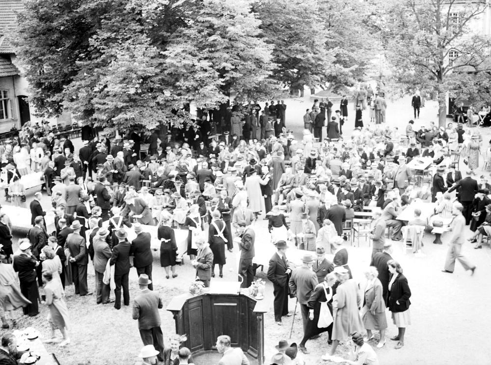Utomhusbild som visar en folksamling framför en talarstol. Framför den sitter åhörare och långbord dukas upp.