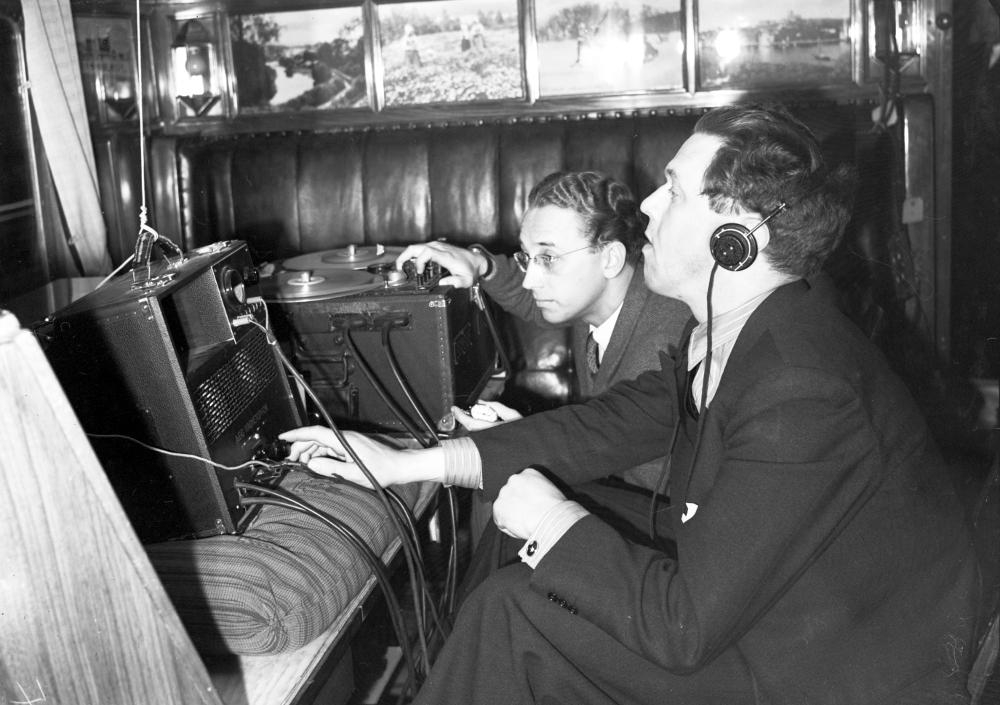 Inomhusbild som visar två män försedda med hörlurar som lyssnar på radio och har bandspelarutrustning med.