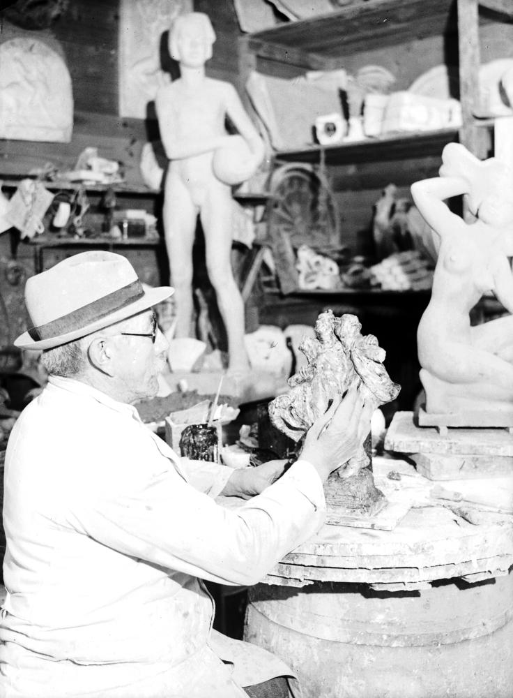 Inomhusbild som visar en skulptör som arbetar.