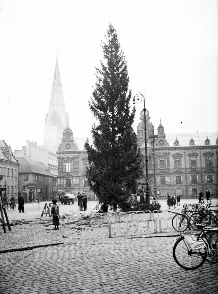Utomhusbild på julgransresning på Stortorget med utsikt över Rådhuset. I bakgrunden syns en häst och vagn.