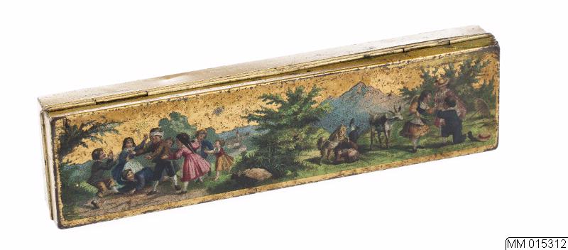 Pennskrin av plåt, rektangulärt, förgyllt. På locket tryckta figurscen med lekande barn. Inredning i tre fack.
