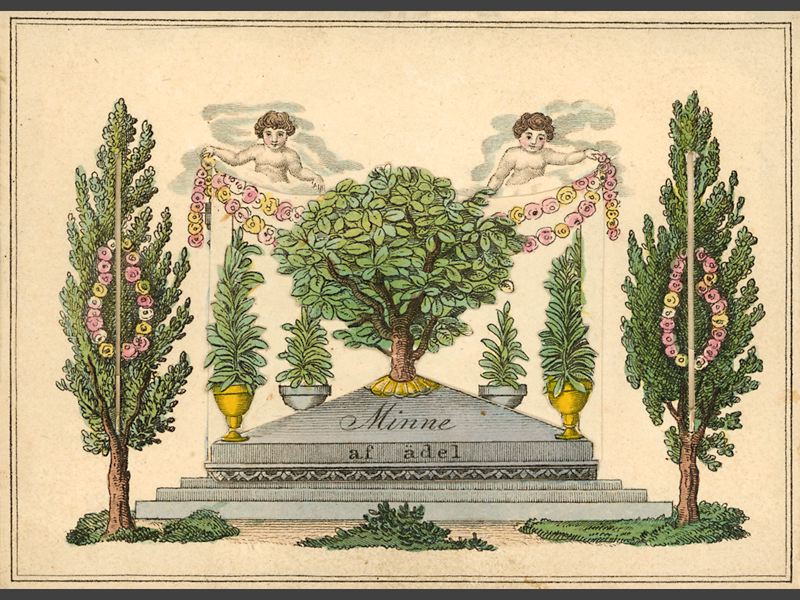 Kort med figurscenerier tryckt i flera färger på vitt papper och