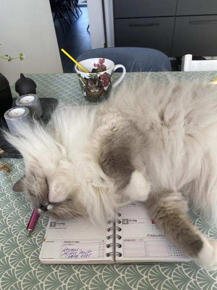 Jobbar med sociala medier men just här tog jag en te paus och organiserade i min analoga kalender. Katten Lillebror är glad att jag jobbar hemma.