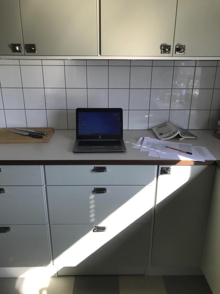 "Hemarbete Covid 19. Femte dagens hemarbete pga Covid 19. Försöker variera arbetsställning och växlar mellan att stå vid köksbänk, sitta vid bord och halvligga i fåtölj. Idag har jag börjat i köket, det är skönt att stå upp och jobba lite, och köket är som soligast under förmiddagen! Hemarbete fungerar ganska bra, även om det faktum att vi är två hemarbetare + två hantverkare i huset om dagarna."