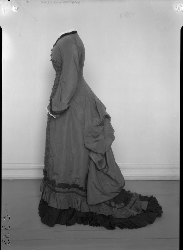 - Klänning av violett siden. Långa ärmar med breda manschetter med en bård i mörkviolett, figursydd i midjan. Hög halsringning och knäppning fram med knappar. Kjoldelen har nedtill veckad volang kantad med plisserat tyg i mörkare violett och turnyrliknande facon bak.