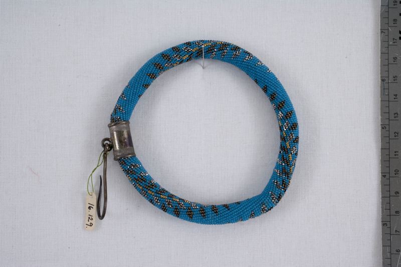 Nystring, med invirkade glas pärlor i blått, guld och silver. Beslag och krok av vitmetall.
