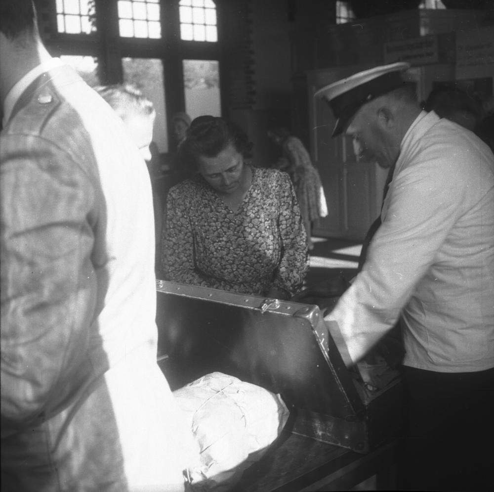 Dansk invasion 1947. Tullare visiterar bagaget för en dansk kvinna.