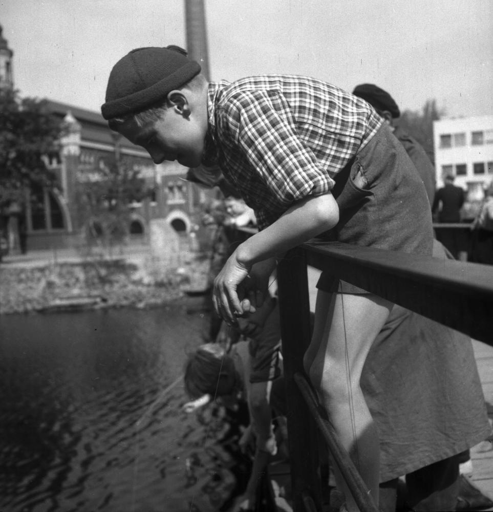 - Pojkar fiskar i kanalen från gamla Paulibron. Pojke hänger över räcke. Elverket vid Stora Nygatan i bakgrunden.