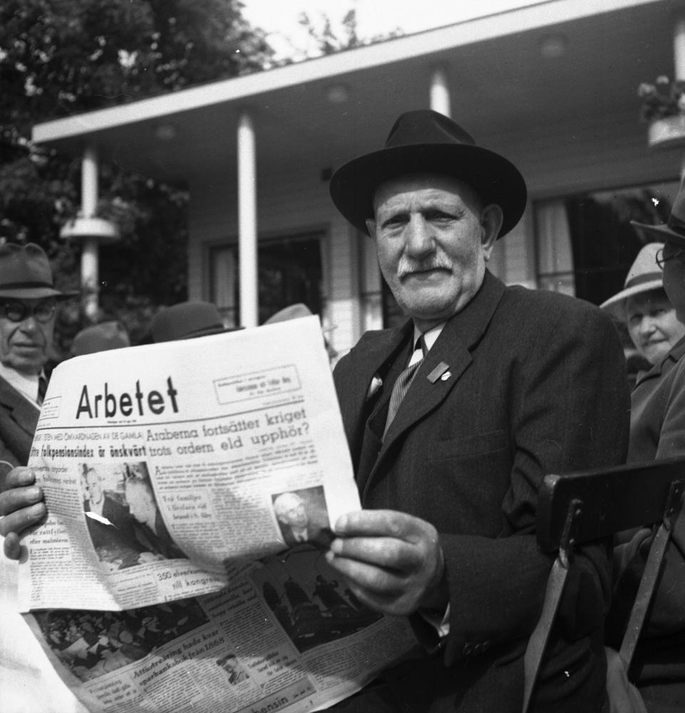 Pensionär läser Arbetet vid Margaretapaviljongen under en pensionärsdemonstration 1947.