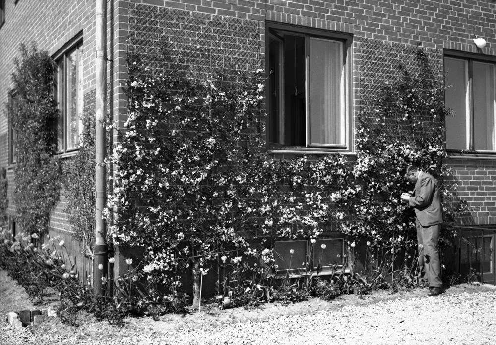 Alnarps lantbrukshögskola, maj 1945. Klängrosor vid skolväggen.