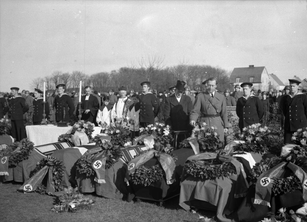 - Tysk militärbegravning på Pålsjö kyrkogård. 41 tyska sjösoldater omkom vid en sjökatastrof i Öresund. Svensk hedersvakt vid de tyska kistorna som är insvepta i naziflaggan.