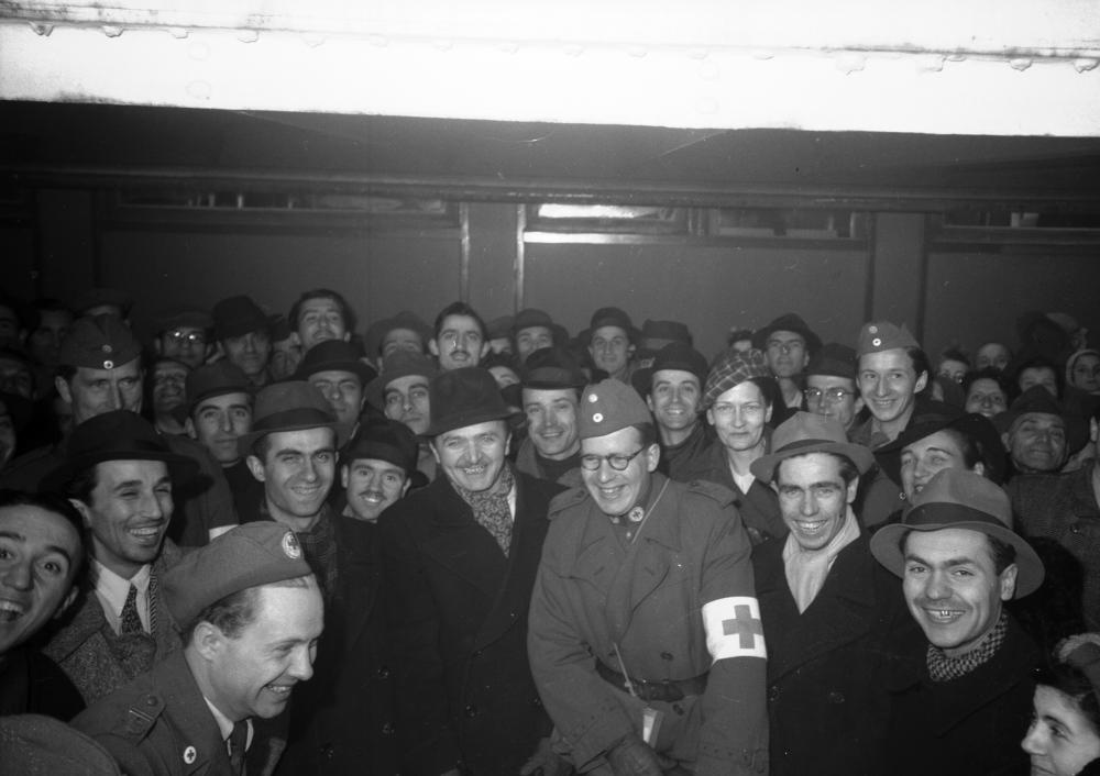 - Krigsfångeutväxling under andra världskrigets slutskede via Helsingborg. Glada frigivna krigsfångar och Röda Kors-personal på ångfärjestationen i Helsingborg.