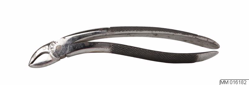 Tandtång (krontång ?)av stål, märkt C. NYROP. Räfflat handtag och huvud i form av en fågelnäbb.