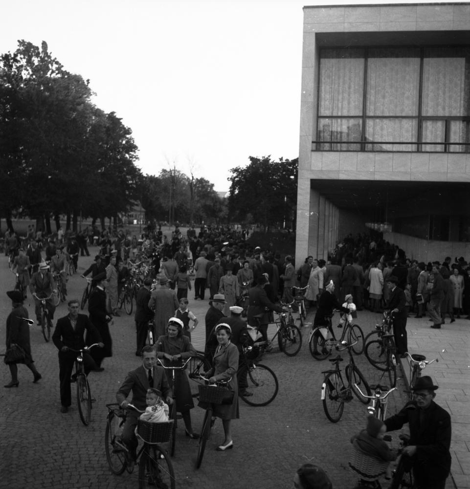Invigningen av Malmö Stadsteater. Malmöbor köar för biljetter till premiären.