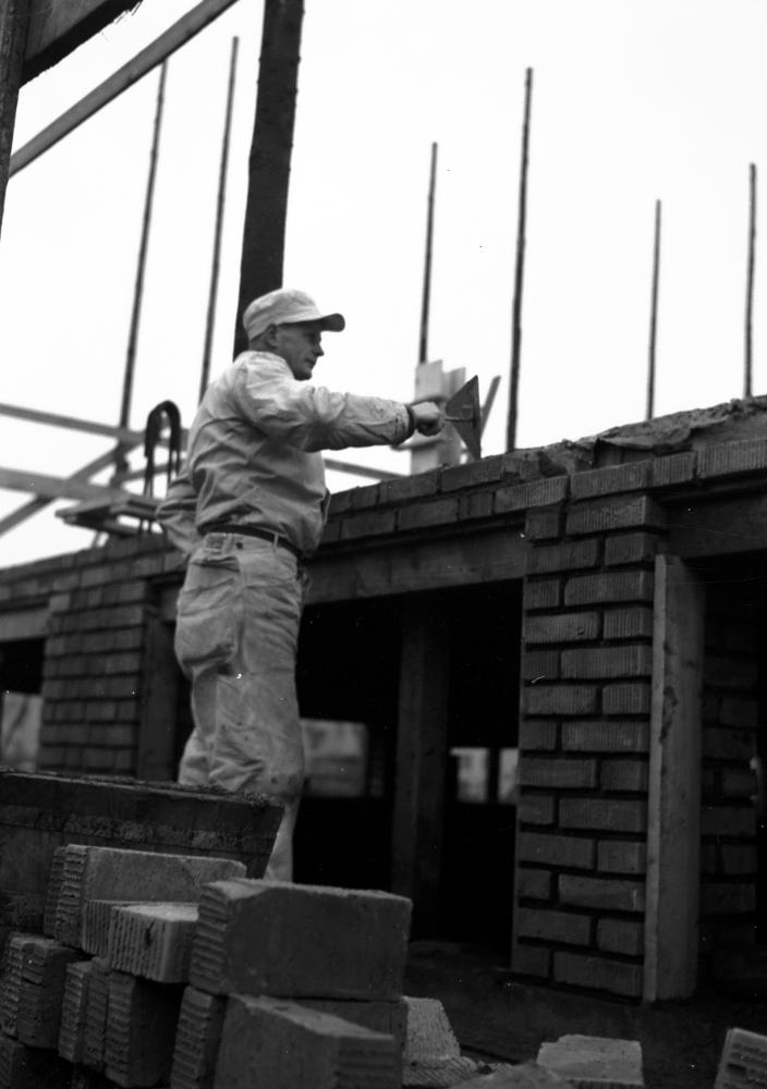 AOL 001691 :: byggnadsställningar, byggnadsindustri, byggnadsarbetare, arbete, nybygge, murare