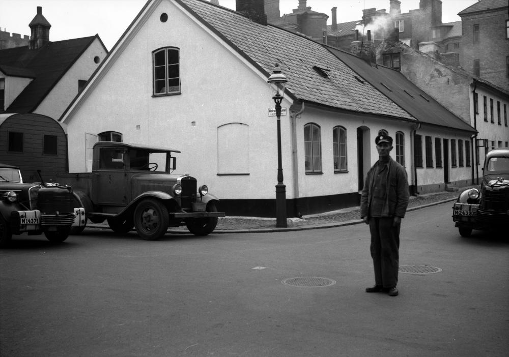 Bilarna står vid Västra Kanalgatan 7 i kvarter nr. 9 Igelkotten. Mannan står i korsningen till Norra Långgatan. Husen där har gemensamt nr. 28 då just denna västra sida är en kort bit och där gatan går runt kvarteret där den omnamnas till Stenhuggaregatan.