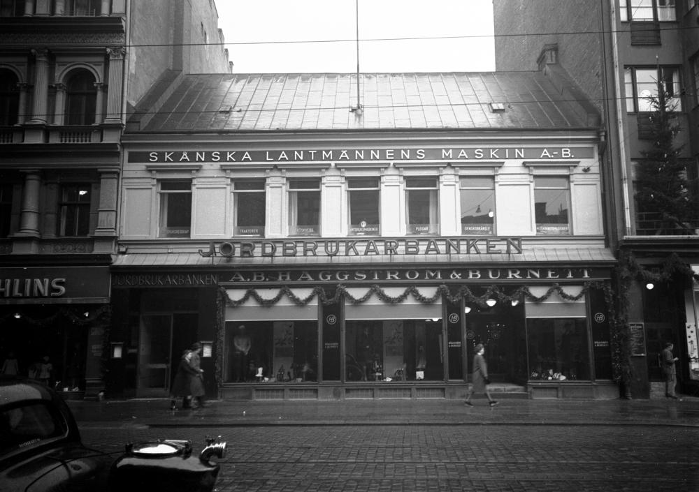 Södergatan 14, kv Claus Mortensen. Jordbrukarbanken blev 1951 Sveriges Kreditbank som byggde nytt hus på tomten 1967.