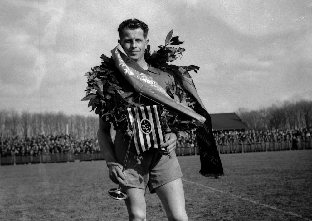 Helsingborgs IF framgångsåret 1941, då laget vann både allsvenskan och cupen. Nils Axelsson lagerkransad vid matchen mot Landskrona Bois.