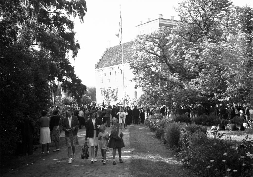 Kvinnor och flickor promenerar, flaggstång och stor byggnad i bakgrunden.