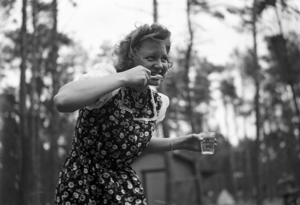 Campande kvinna borstar tänderna Skåne, 1940-tal.