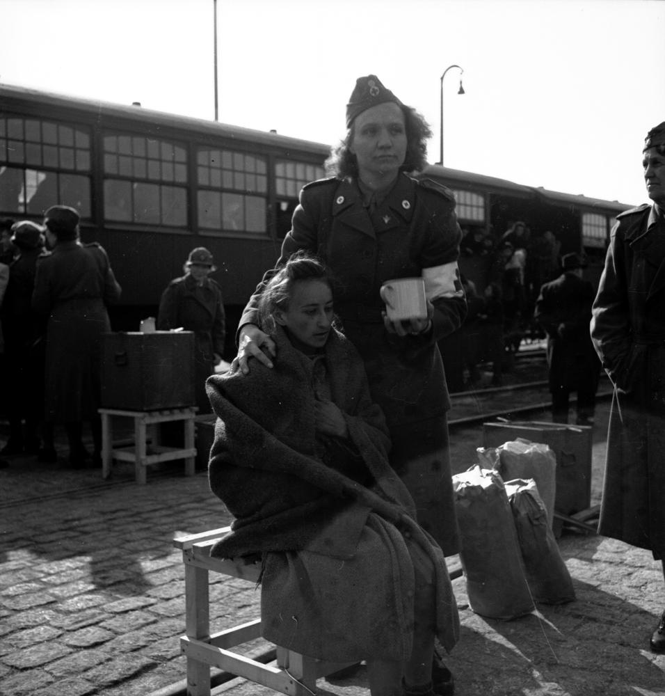 Kvinna blir omhändertagen, tåg i bakgrunden.