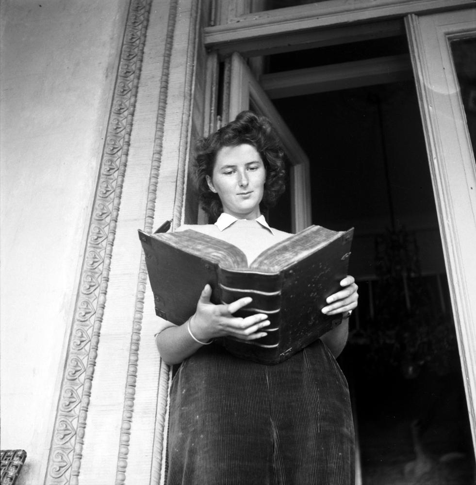 Kulla Gunnarstorp slott, kvinna tittar i en tjock bok.